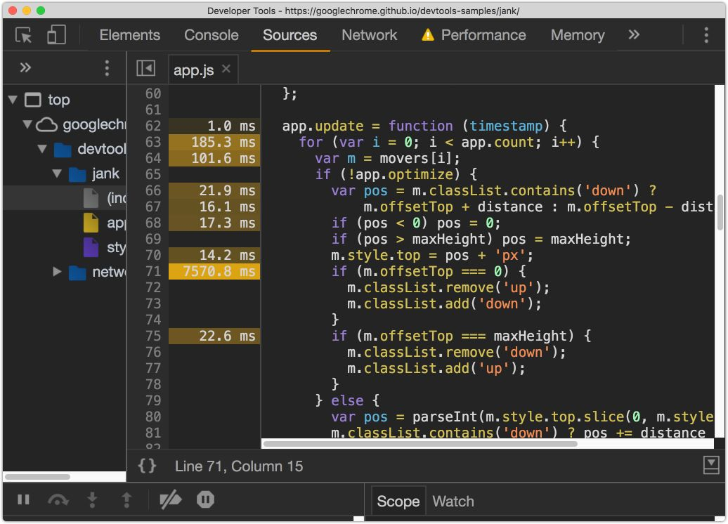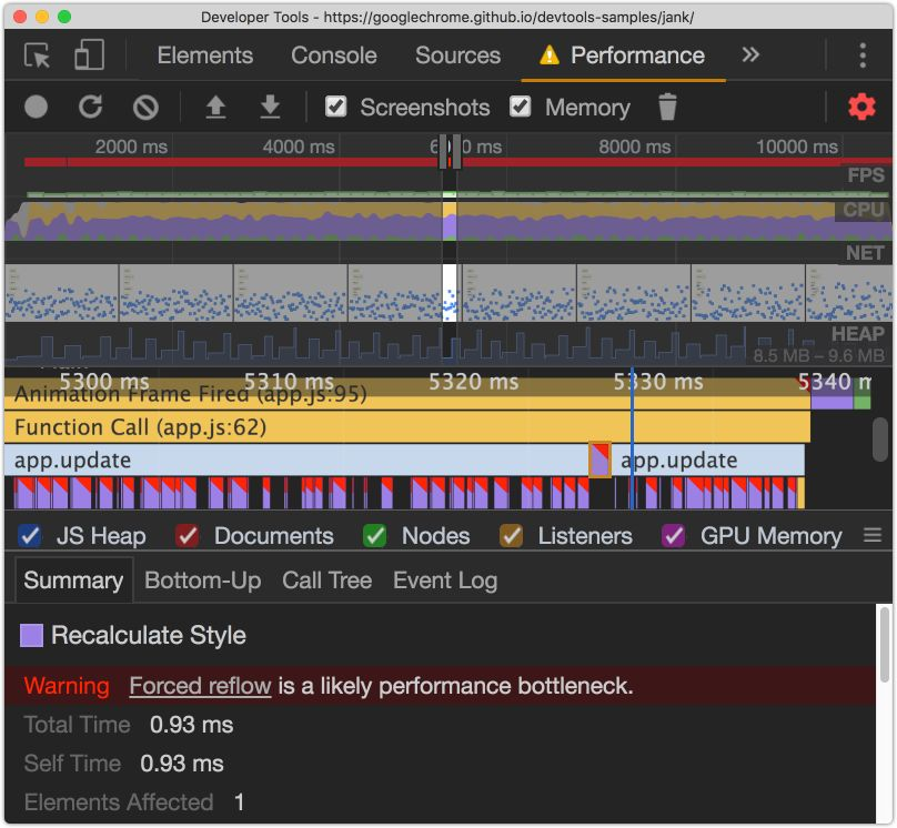 在Summary tab,点击Recalculation Forced下面的app.js:71,DevTools会跳转到触发强制reflow的代码行。