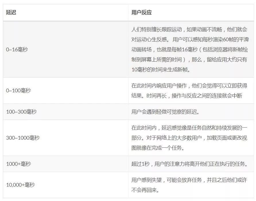 任何网站的终极目标不是让其在任何特定设备上都能运行很快,而是让使用该网站的用户满意。用户花在网站上的大多数时间不是等待加载,而是在使用过程中等待响应。那么怎样评价延迟?让我们来看下面的表: