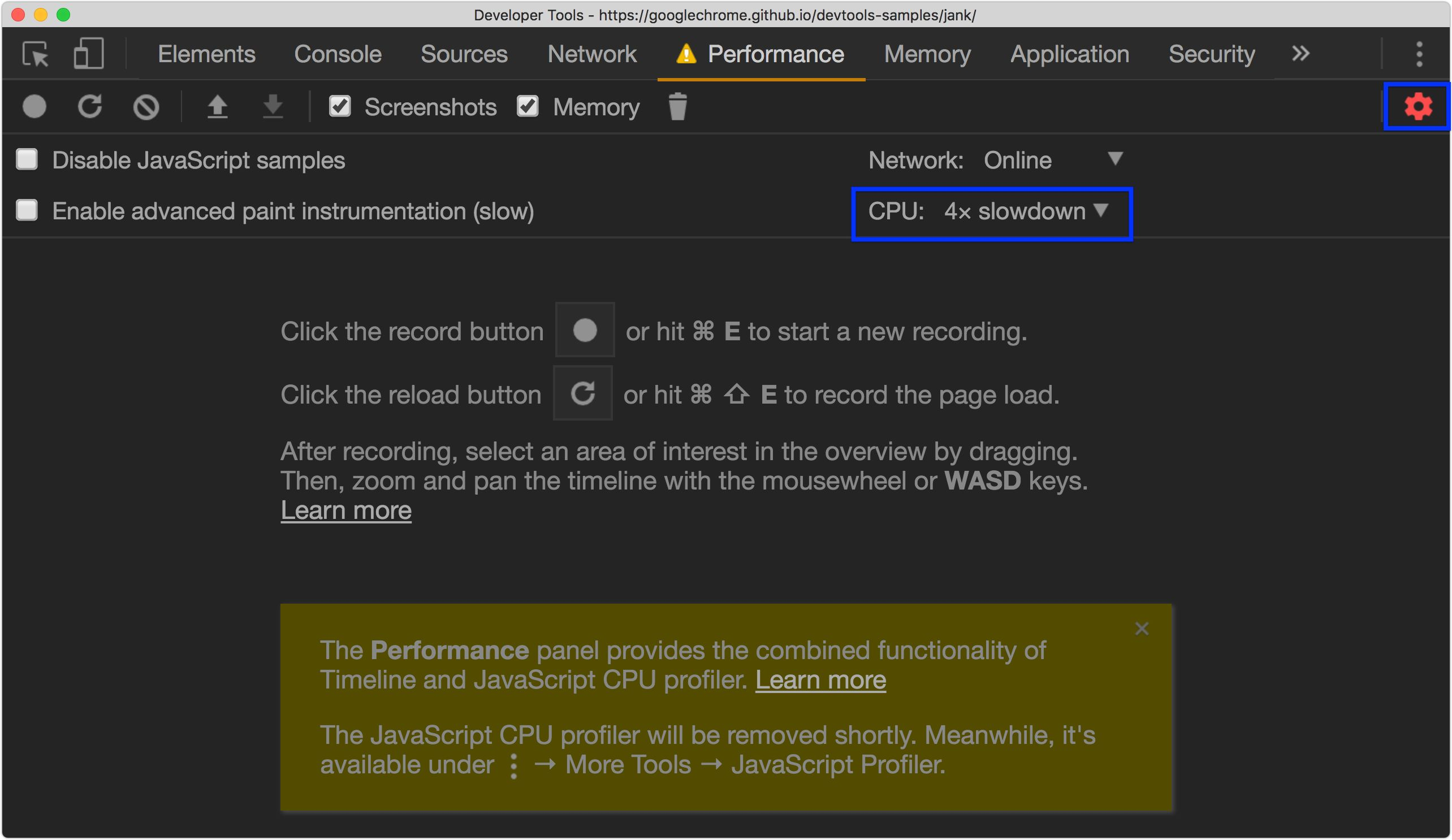 4x slowdown,DevTools会将CPU频率限制到平时的四分之一。