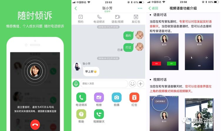 众所周知,对于心理咨询行业,沟通是刚需。通过接入网易云信的即时通讯技术和音视频技术,用户与心理专家可通过语音、文字、图片等形式进行交流。双方在咨询前进行简单的沟通可以帮助咨询师快速判断患者的情况,从而大大提高咨询体验,提高咨询效率。