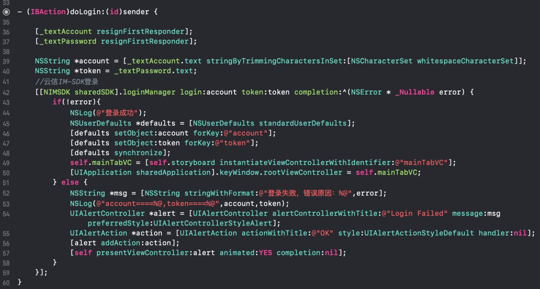 4. 在登录button对应的-doLogin:方法中加入SDK登录的方法,并在登录成功后跳转至主界面。