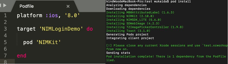 1. 使用Pod集成NIMSDK(视频与本文中均是集成NIMKit,即同时集成IM-SDK与云信UI开源组件NIM_iOS_UIKit,请根据所需自行选择)。