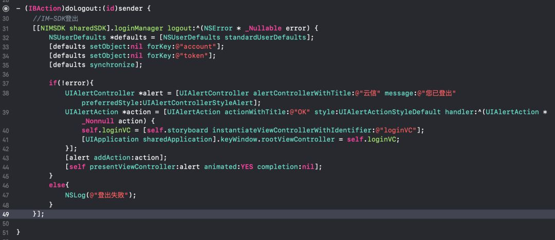 在MainTabVC.m中的-doLogout:方法中加入SDK登出的方法,在登出成功后,跳转回登录界面。