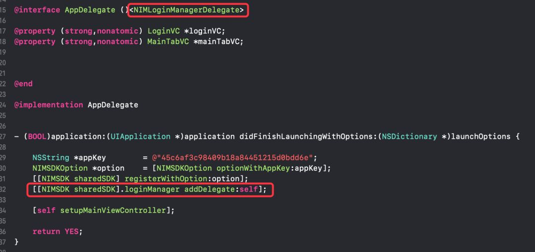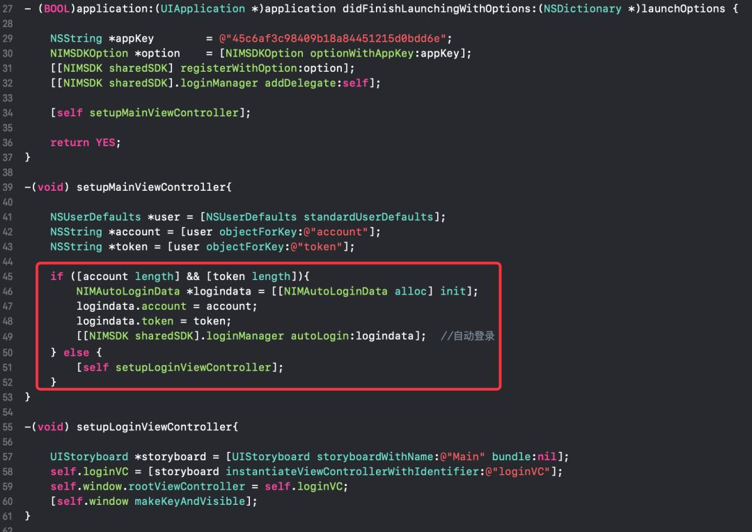 6. 在AppDelegate.m实现自动登录逻辑。即判断当前是否有缓存的accid与token,若有则在自动登录后跳转至原来的界面,否则进入登录界面。