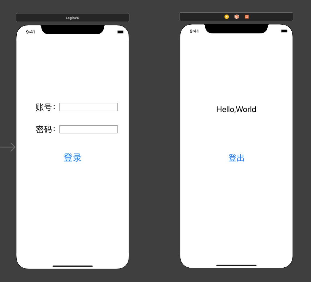 在Main.storyboard对创建好的登录界面类LoginVC和主界面类MainTabVC添加UI元素:Label、Text Field与Button。分别用于信息提示、文本输入与执行登录/登出操作。随后并将元素绑定到对应的代码文件中。