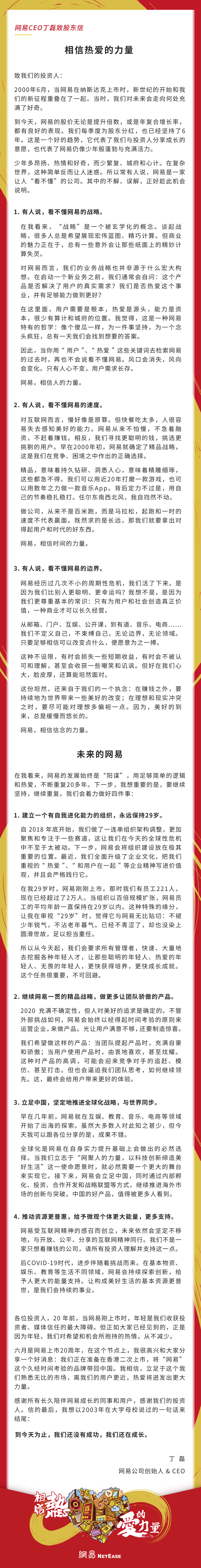 下面,将网易CEO丁磊这篇圈粉无数的股东信附上,以飨读者。
