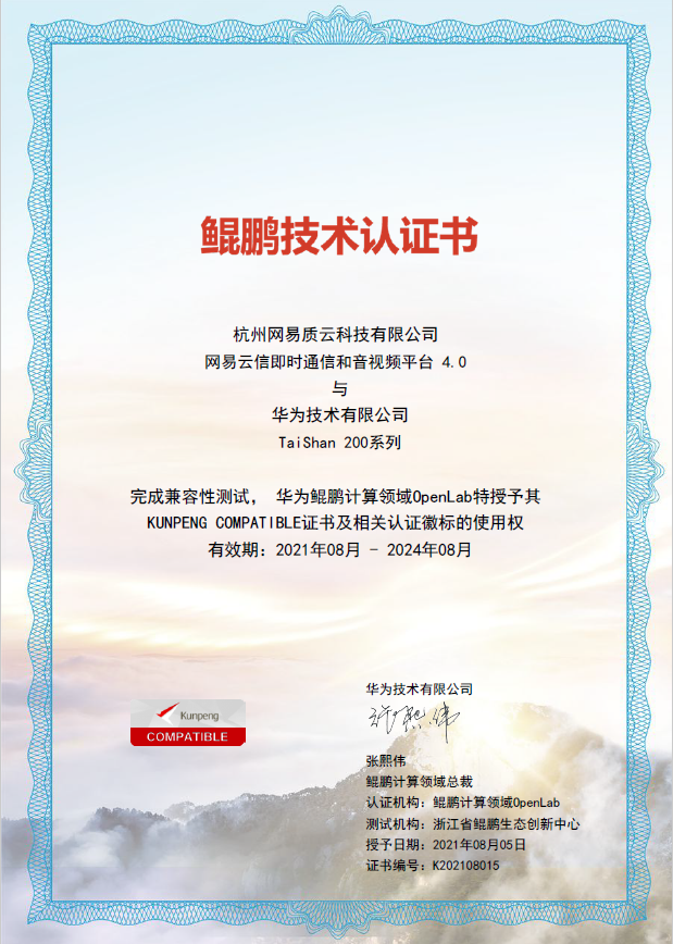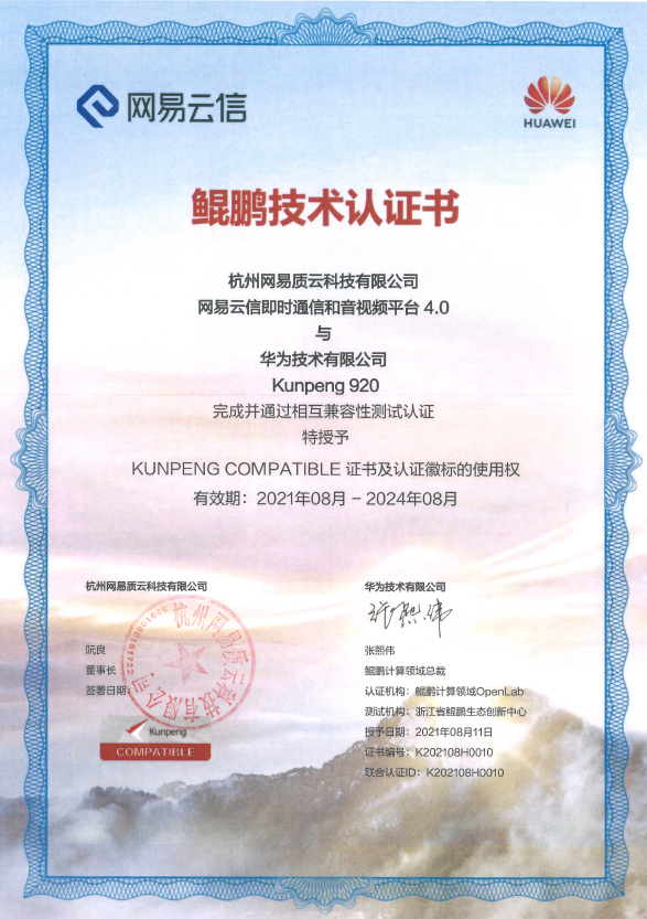 2021年8月,网易云信即时通讯和音视频平台产品完成了华为技术有限公司 TaiShan200 系列和 KunPeng920 的兼容性测试,并获得华为鲲鹏计算领域 OpenLab 证书。