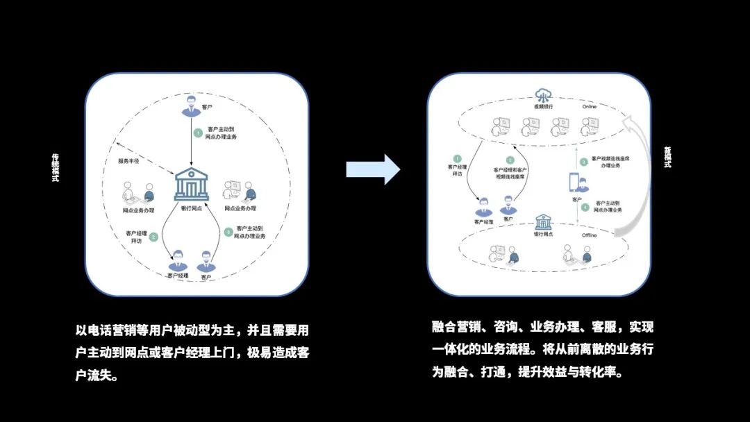以视频营业厅为例,视频营业厅作为整个远程 AI 银行解决方案的核心模式,可以实现将传统的以银行网点为中心、营销范围窄、客群关系维护复杂、靠电话联系、客户上门或者经理上门的方式,慢慢转向以用户为中心的模式。通过 AI 视频银行的形式,依托云计算、大数据、生物识别、音视频技术等技术,实现用户随时随地接入银行办理业务。