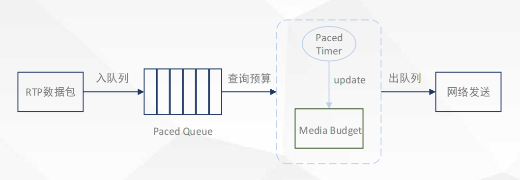 平滑发送(Paced Send)通过令牌桶限速机制来实现对发送速度的控制。所有待发送的 RTP 数据包(包括编码、FEC、重传包),都先放入优先级队列中进行管理,定时器根据带宽估计值和 Pacer 系数定期更新预算。当预算不为零时,直接发送队列中的数据并消耗预算,预算消耗完,暂停发送数据。