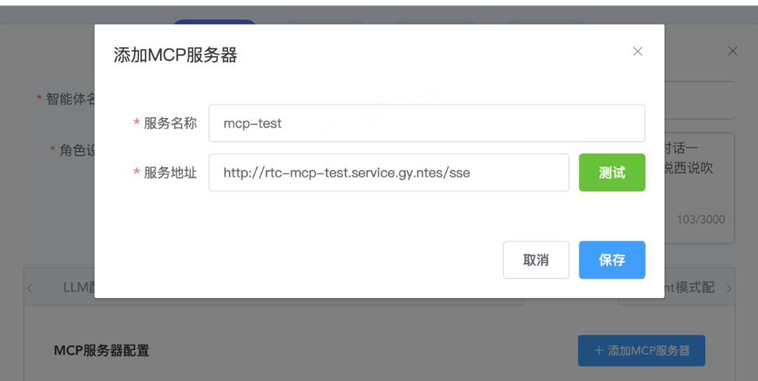这里,域名 rtc-mcp-test.service.gy.ntes 指向的是网易云信开发的一个示例 MCP server,点击测试可以拉取 tools 列表,测试完成后,点击保存即可。
