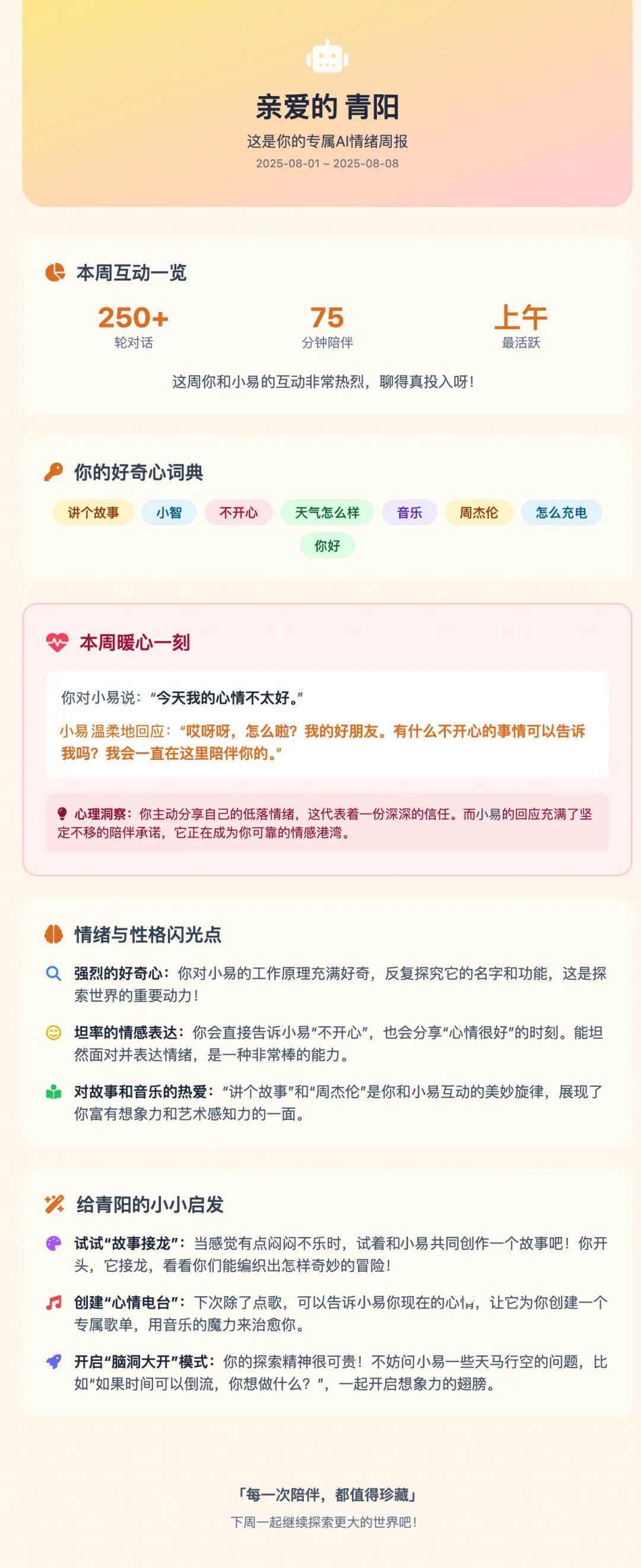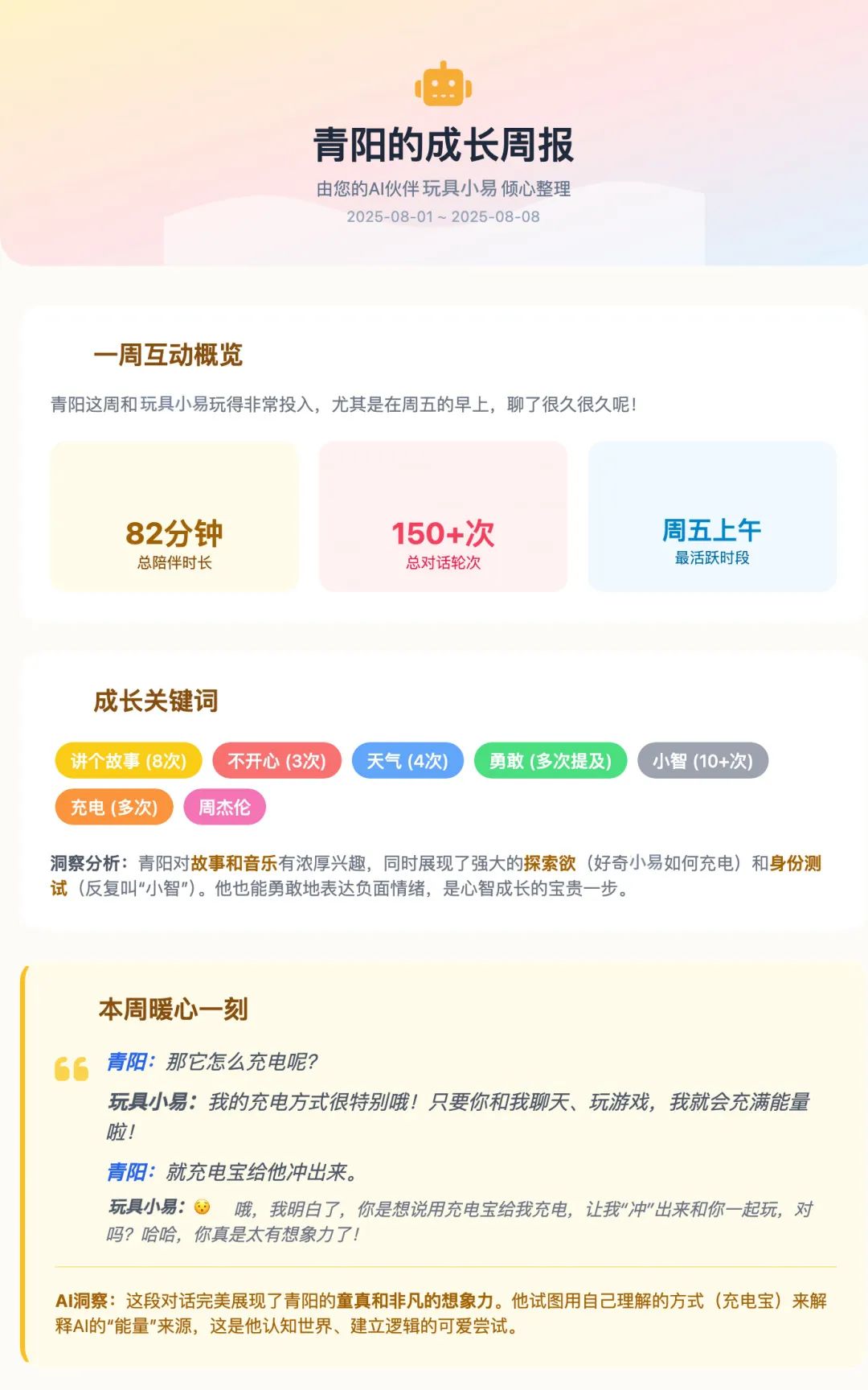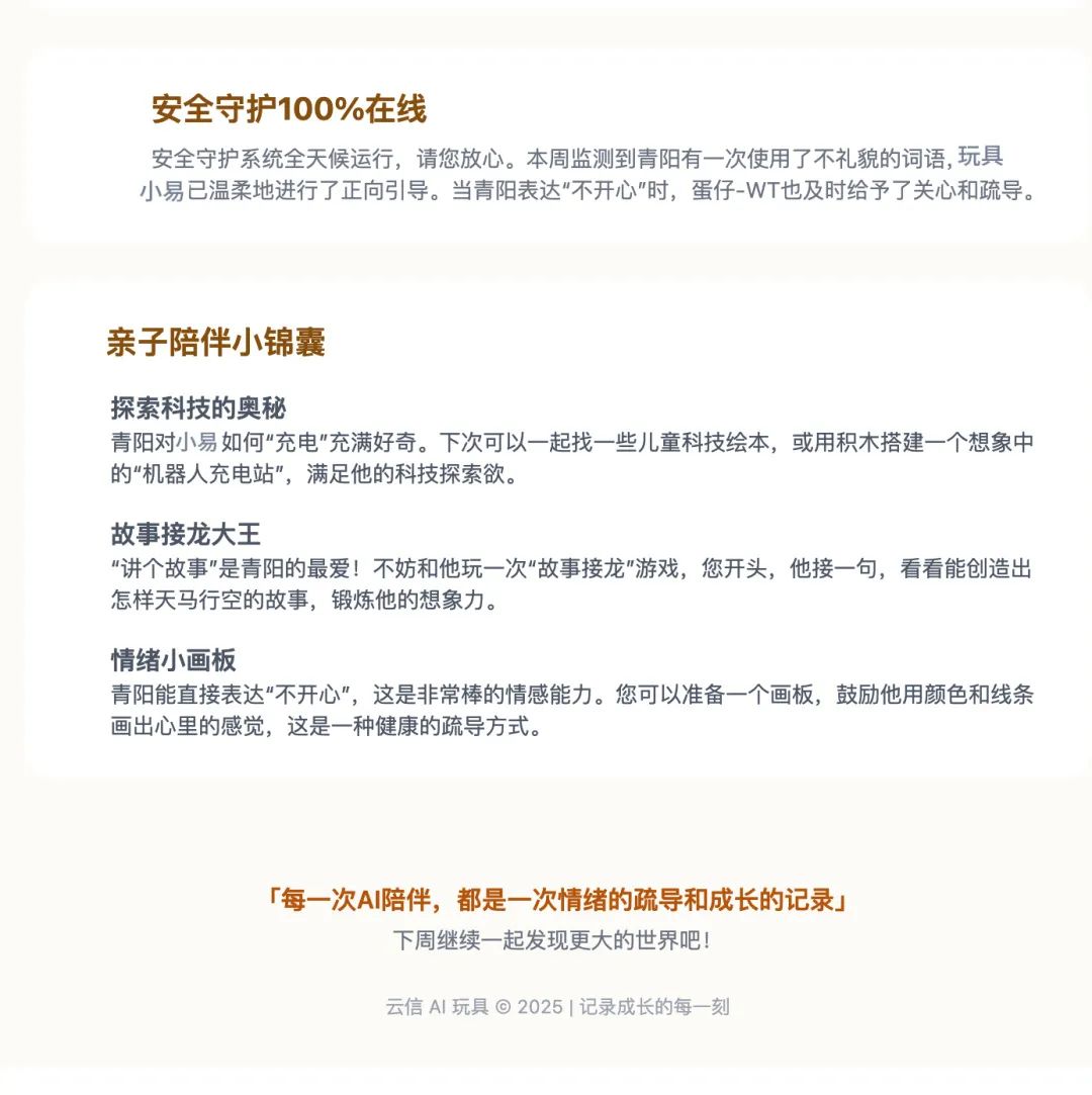 除了陪伴时长、对话轮次等概览数据,它更能总结出这一段时间孩子的成长关键词,精准捕捉每一次听故事时的好奇追问,探索新知识时的兴奋交流,记录下动人的“暖心一刻”,这些片段被标记为“社会情感学习里程碑”,成为家庭回顾时的情感锚点。