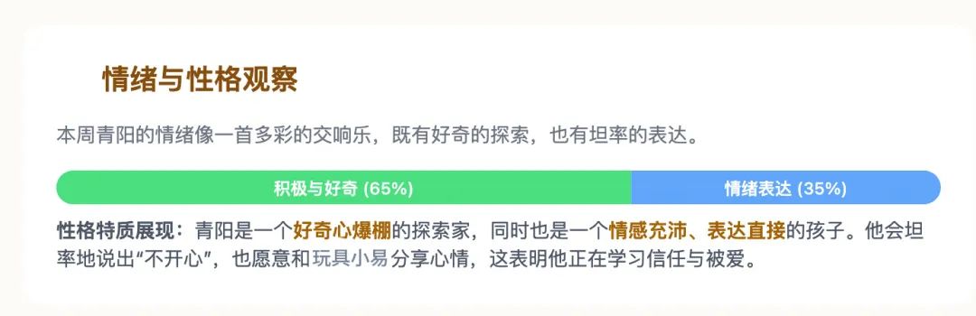 智能体通过对话的语气、用词和互动频率,分析孩子的情绪变化,帮助家长读懂孩子未说出口的心绪,用直观的情绪占比,呈现孩子情绪状态。同时挖掘性格闪光点:探究 “充电” 原理,是好奇心爆棚;难过时安慰他人,是富有共情力;清晰表达 “不开心”,是情绪管理的健康起步。
