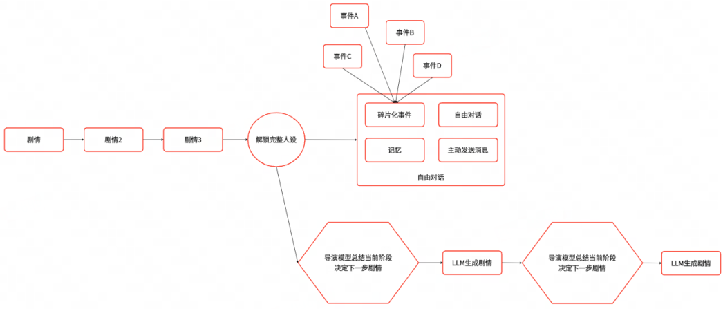 它在技术架构上,将手写主线剧情的强引导性、碎片化事件的随机吸引力、自由对话的开放性、记忆系统的连续性以及导演模式的动态规划能力,统一于一个协调的智能调度系统之下。其工作流程始于一段精心构建的线性剧情,以最高效率完成情感破冰与角色塑造,平滑地解锁人设,将用户引入一个充满可能性的开放世界;与此同时,导演逻辑始终在后台保持活跃,在关系发展的平稳期、瓶颈期或跃升期适时介入,利用LLM的生成能力创造全新的、个性化的剧情篇章。