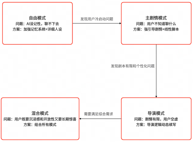 作为故事引擎的灵魂,叙事模式将无序的信息交换,升华为有序的情感连接和意义构建。没有叙事,AI的回应只是基于上下文的、离散的文本碎片,叙事模式为这些碎片提供了时间顺序、因果逻辑和情感脉络。没有叙事,纯粹的开放世界会让人不知所措,叙事模式通过提供目标、悬念和期待,解决了用户的“冷启动”和“长期动力”问题。叙事模式是角色弧光和关系发展的唯一载体,通过共同经历预设的或动态生成的事件,角色得以展现其多面性。