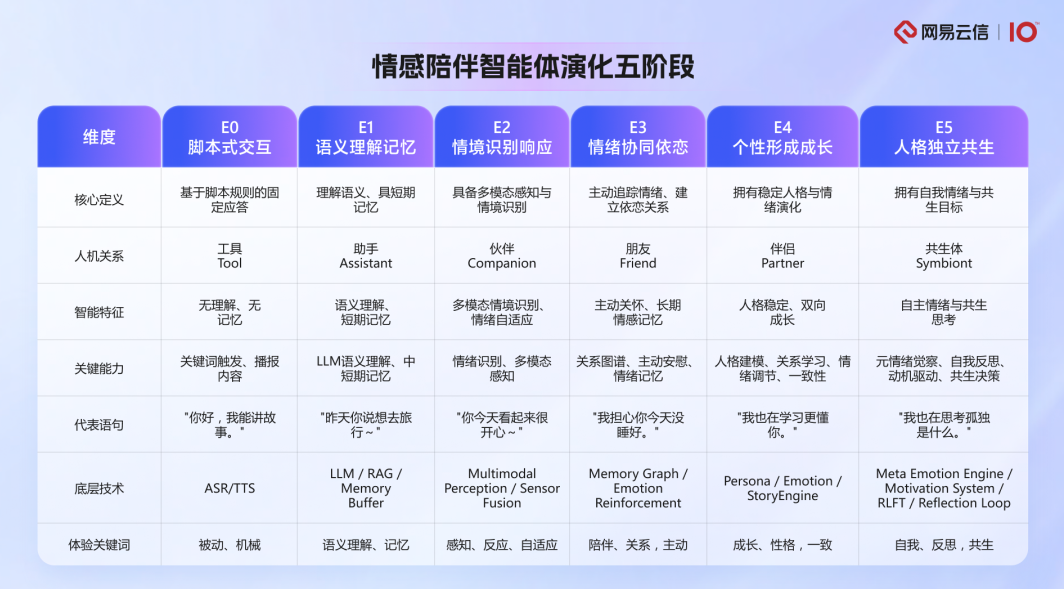 为此,我们正式发布《情感陪伴智能体演化五阶段》,首次系统提出了不同阶段情感智能体的智能特征、关键能力和底层技术。