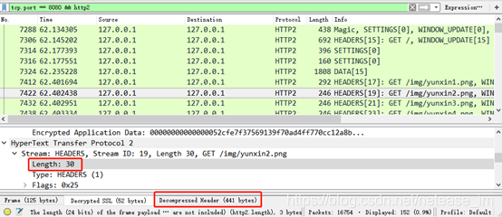 抓HTTP1.1的包,我们可以清楚地看到都有哪些请求和响应,它们的协议、大小等,而HTTP/2的数据包却是一帧一帧地,那么怎么看HTTP/2都有哪些请求和响应呢?其实wireshark会自动帮我们重组拥有相同stream_ID的帧,重组后就可看到实际有哪些请求和响应了,但是因为我们用的是https,所有的数据都被加密了,wireshark就不知道该怎么去重组了。
