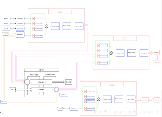 从图中可以看出,我们使用了一个I/O Unit作为最核心的部件,用于驱动整个流程,同时使用三个Audio Processing Graphs作为混音器。三个Audio Processing Graphs分别代表播放混音器,发送混音器,录制混音器。每个混音器有三个Unit最为其部件,音频混音Mixing(kAudioUnitSubType_MultiChannelMixer),音频格式转换(kAudioUnitSubType_AUConverter),音频通用输出(kAudioUnitSubType_GenericOutput)。同时支持多路输入,一路输出。