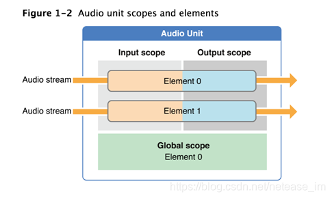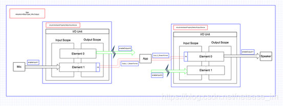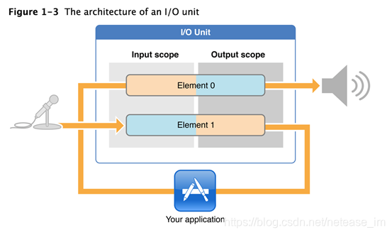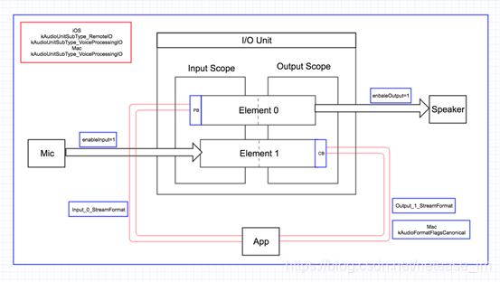 一个I/O Unit包含两个实体对象,两个实体对象(Element 0、Element 1)相互独立。Element 1与硬件输入(麦克风或者听筒)连接,并且Element 1的输入域(input scope)对你不可见,你只能读取它的输出域的数据及设置其输出域的音频格式;Element 0与硬件输出(扬声器或者听筒)连接,并且Element 0的输出域(ouput scope)对你不可见,你只能写入它的输入域的数据及设置其输入域的音频格式。