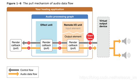 在一个音频处理图,当需要更多的音频数据时,使用者调用提供者。有源源不断的音频数据流的请求,这个控制流的方向和音频流方向相反。