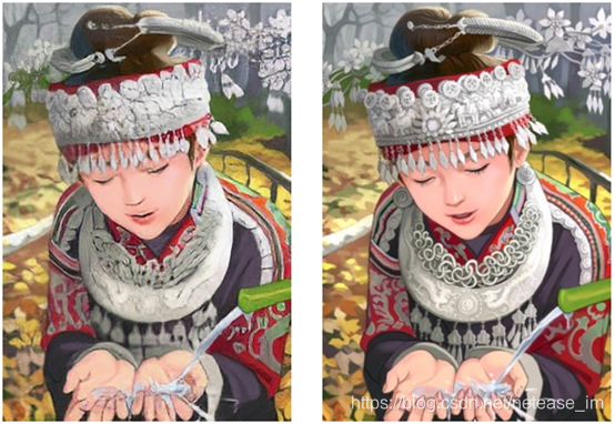 图4. 上图左侧为SRGAN模型[2]放大4倍生成的图片,可以看到首饰的纹理被大幅修改。