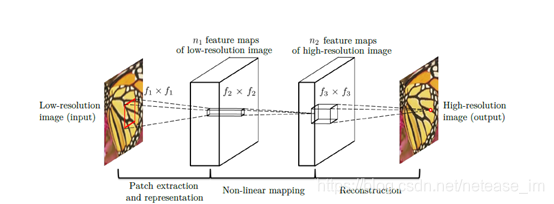 下图是一个简单的例子,来自经典的超分算法SRCNN[1]。模型基于卷积神经网络,以原始图像为输入,先是用廉价的上采样算法将分辨率提升到期望的大小, 然后经过3层分别为9x9x128,3x3x64,5x5的卷积运算,得到超分输出。