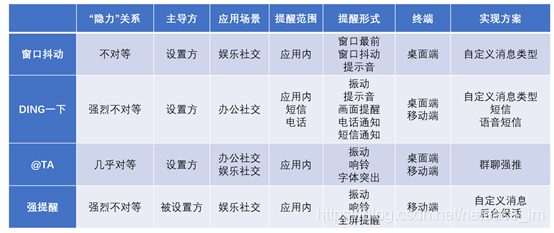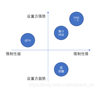 以强制性强弱和设置方在社交关系中的“隐力”强弱,我们建立二维坐标系。可以看到,上面提到的四个IM强制提醒功能各不相同:DING一下和窗口抖动,显然设置方更为强势一些,强制性也非常强,@TA作为同类产品,强制性弱,发送方和接收方的“隐力”关系相对平等,而微信强提醒则完全处于另一个象限:设置方处于“隐力”关系弱势,强制性也非常强。