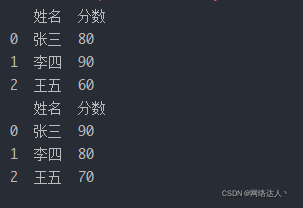 data_list = [{"语文": {"姓名": ["张三", "李四", "王五"], "分数": [80, 90, 60]}}, {"数学": {"姓名": ["张三", "李四", "王五"], "分数": [90, 80, 70]}}]