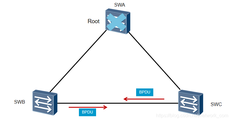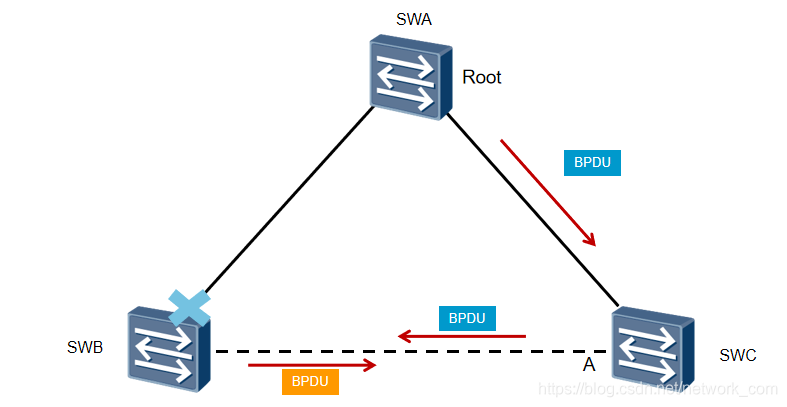 本例中,SWB与SWA之间的链路发生了某种故障(非物理层故障),SWB因此一直收不到来自SWA的BPDU报文。等待Max Age定时器超时后,SWB会认为根桥SWA不再有效,并认为自己是根桥,于是开始发送自己的BPDU报文给SWC,通知SWC自己作为新的根桥。在此期间,由于SWC的Alternate端口再也不能收到包含原根桥ID的BPDU报文。