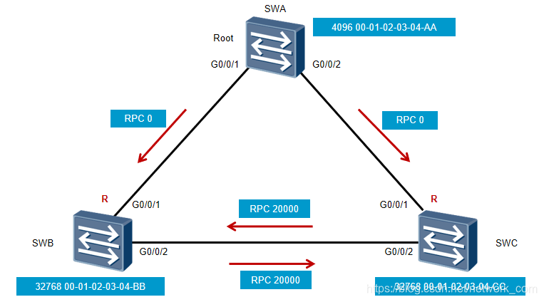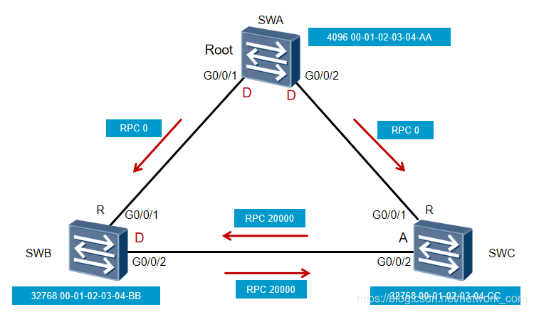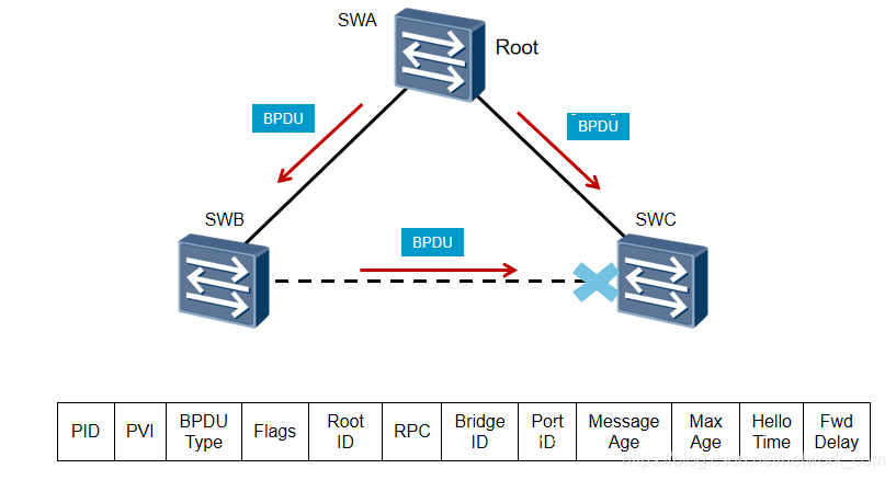 在网络拓扑稳定以后,只有根桥主动发送配置BPDU,其他交换机在收到上游传来的配置BPDU后,才会发送自己的配置BPDU。