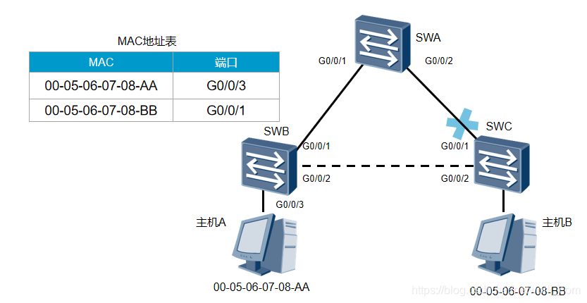 根据交换机的转发原则,如果交换机从一个端口上接收到的是一个广播帧,或者是一个目的MAC地址未知的单播帧,则会将这个帧向除源端口之外的所有其他端口转发。如果交换网络中有环路,则这个帧会被无限转发,此时便会形成广播风暴,网络中也会充斥着重复的数据帧。 本例中,主机A向外发送了一个单播帧,假设此单播帧的目的MAC地址在网络中所有交换机的MAC地址表中都暂时不存在。SWB接收到此帧后,将其转发到SWA和SWC,SWA和SWC也会将此帧转发到除了接收此帧的其他所有端口,结果此帧又会被再次转发给SWB,这种循环会一直持续,于是便产生了广播风暴。交换机性能会因此急速下降,并会导致业务中断。