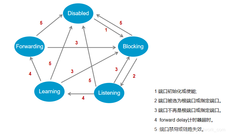 图中所示为STP的端口状态迁移机制,运行STP协议的设备上端口状态有5种: