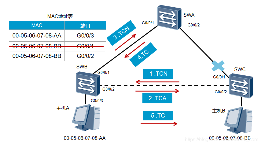拓扑变化过程中,根桥通过TCN BPDU报文获知生成树拓扑里发生了故障。根桥生成TC用来通知其他交换机加速老化现有的MAC地址表项。 拓扑变更以及MAC地址表项更新的具体过程如下: