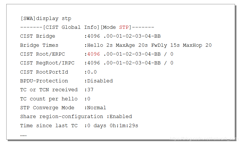 CIST Root/ERPC参数标识根桥ID以及此交换机到根桥的根路径开销。