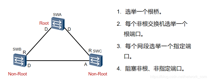 STP通过构造一棵树来消除交换网络中的环路。 每个STP网络中,都会存在一个根桥,其他交换机为非根桥。根桥或者根交换机位于整个逻辑树的根部,是STP网络的逻辑中心,非根桥是根桥的下游设备。当现有根桥产生故障时,非根桥之间会交互信息并重新选举根桥,交互的这种信息被称为BPDU。BPDU中包含交换机在参加生成树计算时的各种参数信息,后面会有详细介绍。
