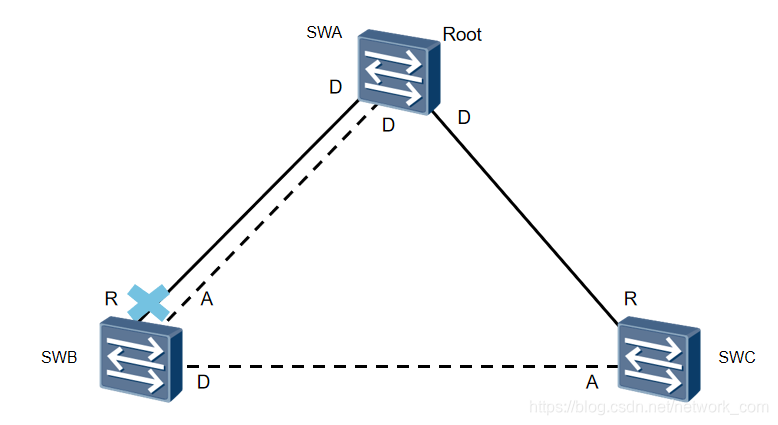 此例中,SWA和SWB使用了两条链路互连,其中一条是主用链路,另外一条是备份链路。生成树正常收敛之后,如果SWB检测到根端口的链路发生物理故障,则其Alternate端口会迁移到Listening、Learning、Forwarding状态,经过两倍的Forward Delay后恢复到转发状态。