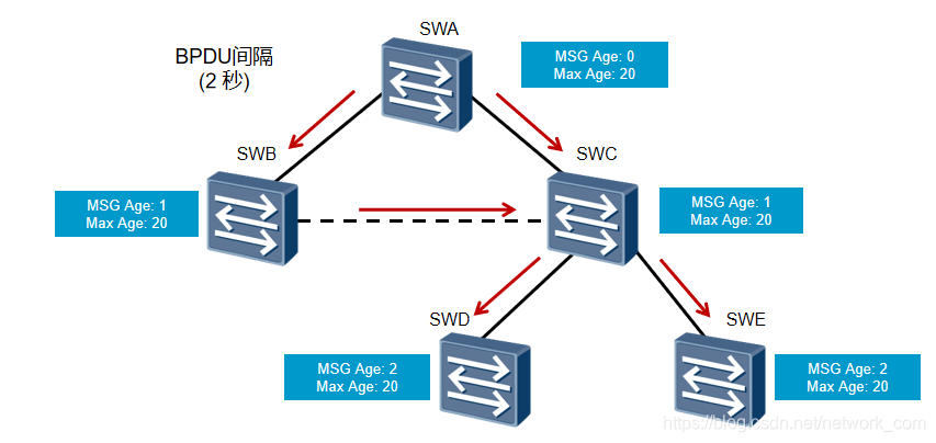Message Age是从根桥发送到当前交换机接收到BPDU的总时间,包括传输延时等。如果配置BPDU是根桥发出的,则Message Age为0。实际实现中,配置BPDU报文每经过一个交换机,Message Age增加1。