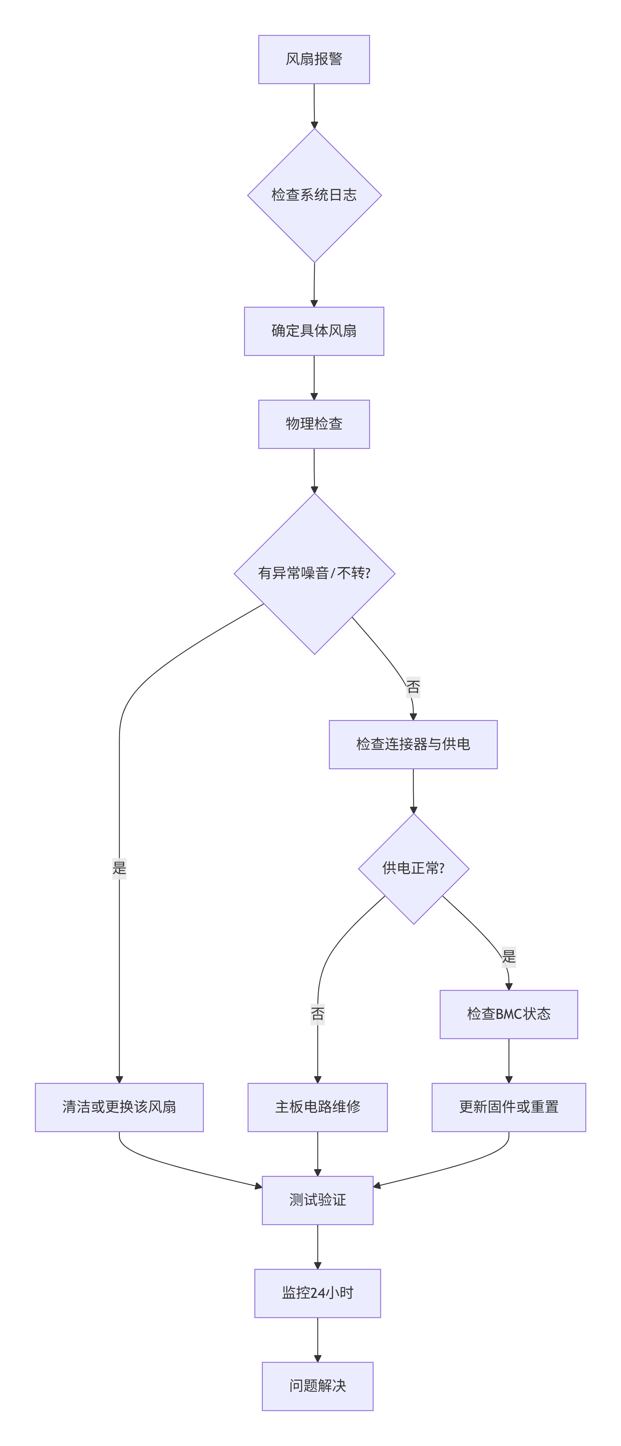 | 单个风扇不转 | 风扇电机损坏、轴承卡死 | 中(冗余系统可暂时运行) |