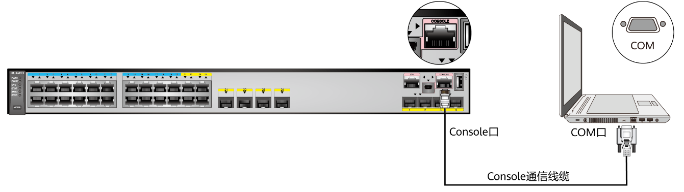 - 通过 Console 口连接交换机。将 Console 通信电缆的 DB9(孔)插头插入 PC 机的 COM 口中,再将 RJ-45 插头端插入设备的 Console 口中。