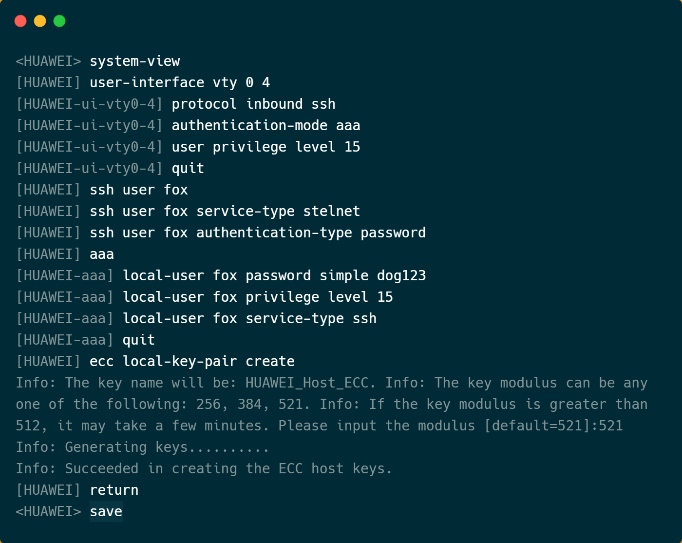 如果有 SSH/Telnet 账号且具有管理员权限,就可以通过 SSH/Telnet 登录设备,修改 Console 口登录密码,然后保存配置。下面以 SSH 举例: