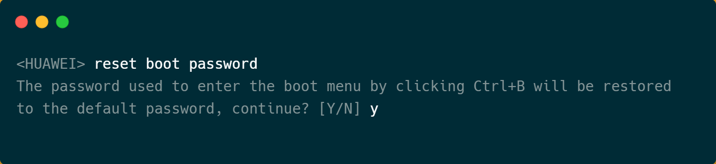 如果忘记 BOOT 菜单密码,但是可以通过 SSH/Telnet 登录交换机,就能恢复 BOOT 密码为默认值。