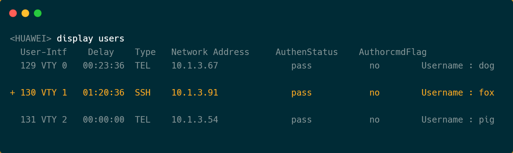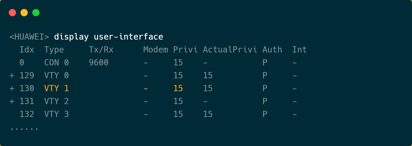 - 使用 SSH 账号登录设备后,确认当前账号权限为 3 级或 3 级以上。使用 display users 命令查看当前设备所有登录用户。其中带 “ + ” 标记行表示为当前用户,记录对应的编号 VTY1 。