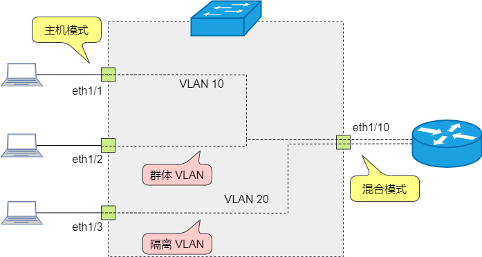 交换机通过设置,可以轻易的修改物理端口的属性,让这个物理端口加入到某一个 VLAN 之中,而不需要改变对应的物理线路。