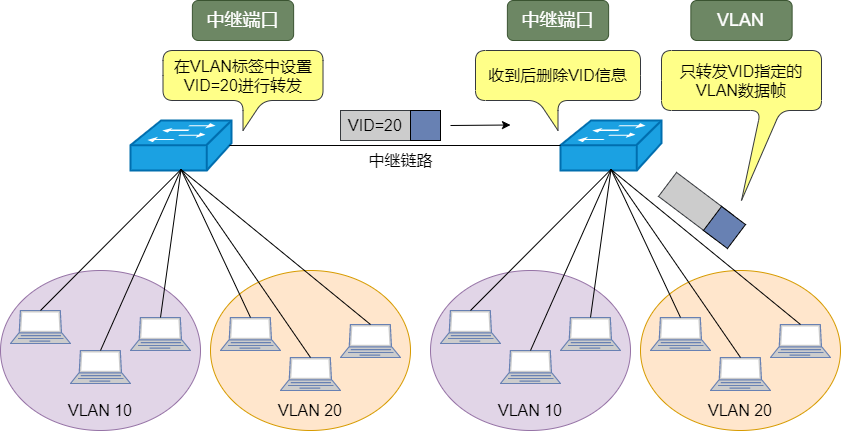 使用标签 VLAN( tag VLAN )向其它交换机传递 VLAN ID 时,首先设置中继端口( trunk port )。trunk port 能够属于多个 VLAN ,与其它交换机进行多个 VLAN 的数据帧收发通信。两台交换机 trunk port 之间的链路叫做中继链路( trunk link )。