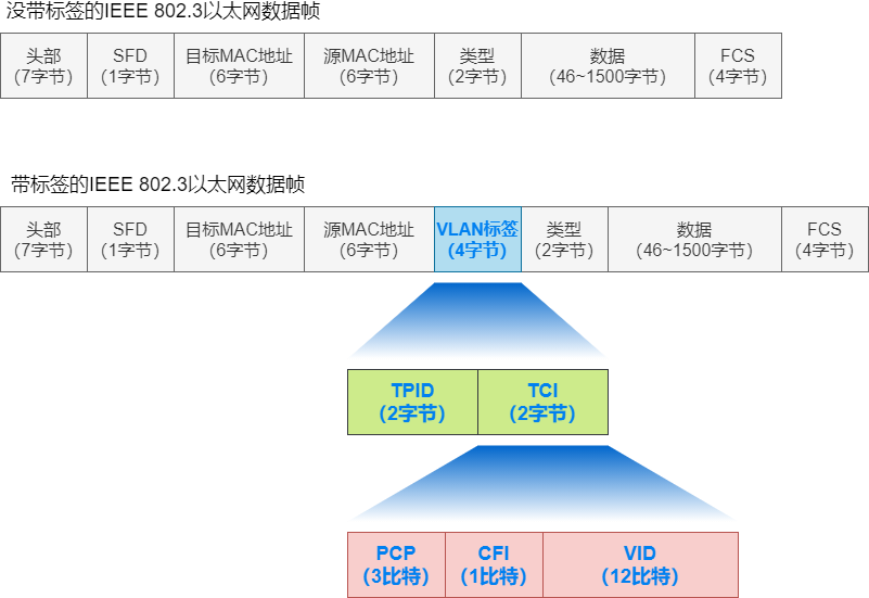 IEEE 802.1Q 还定义了一个字段:TCI ,TCI 可以分为 3 个类型:PCP 、CFI 和 VID 。