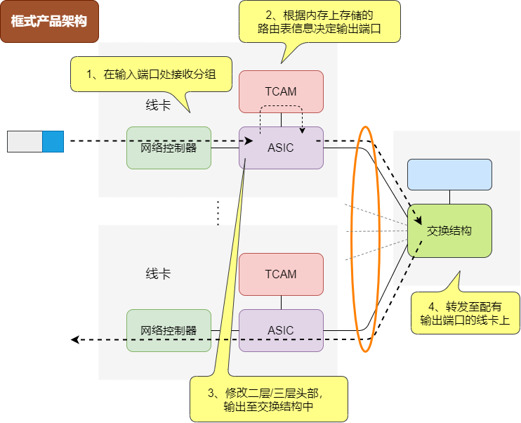 框式三层交换机由路由引擎、交换结构、线卡模块、风扇模块和电源模块组成,一般作为企业的核心交换机用在数据中心。