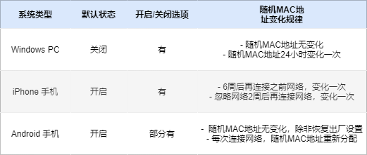 非永久性随机分配,每次连接一个无线网络,都会重新分配一个随机 MAC 地址。