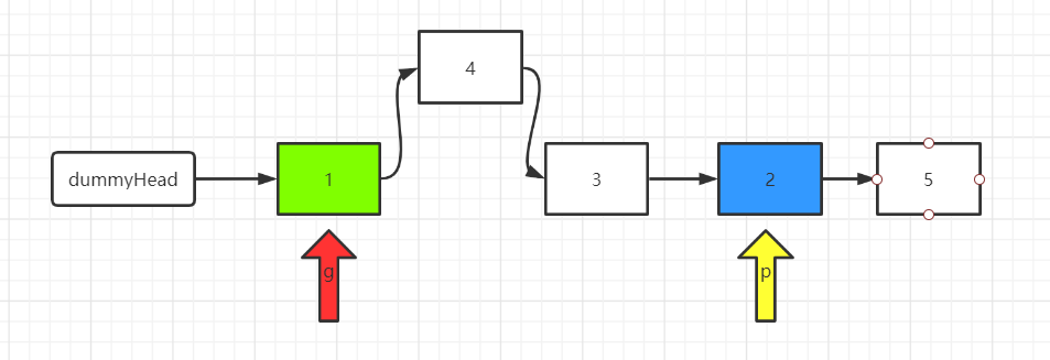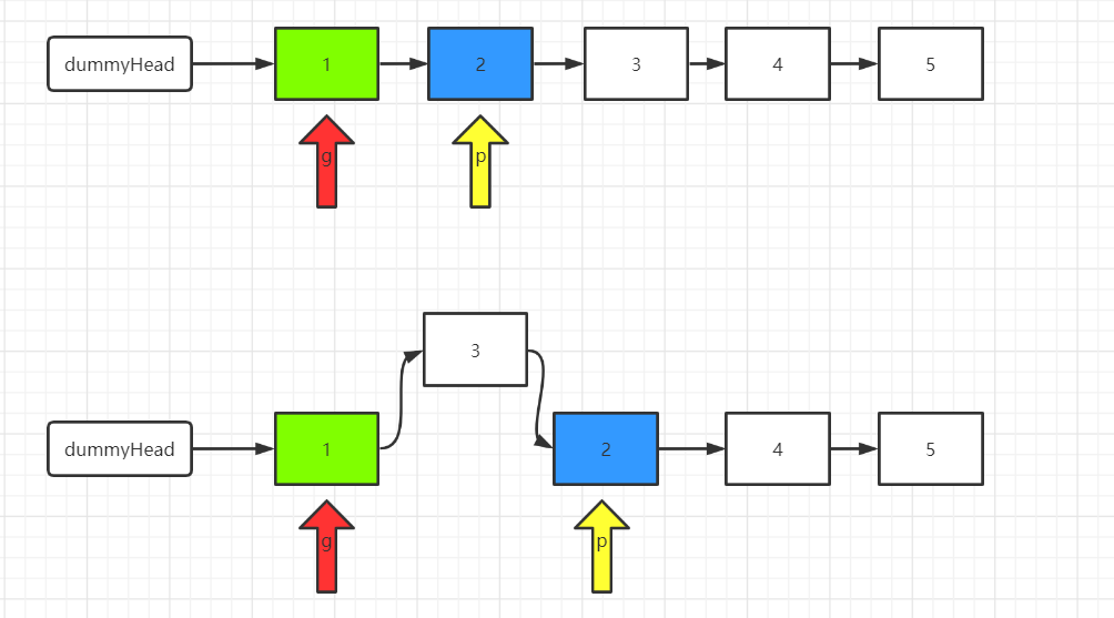 cur.next = t.next;//第一轮 2指向4,第二轮 2指向5
