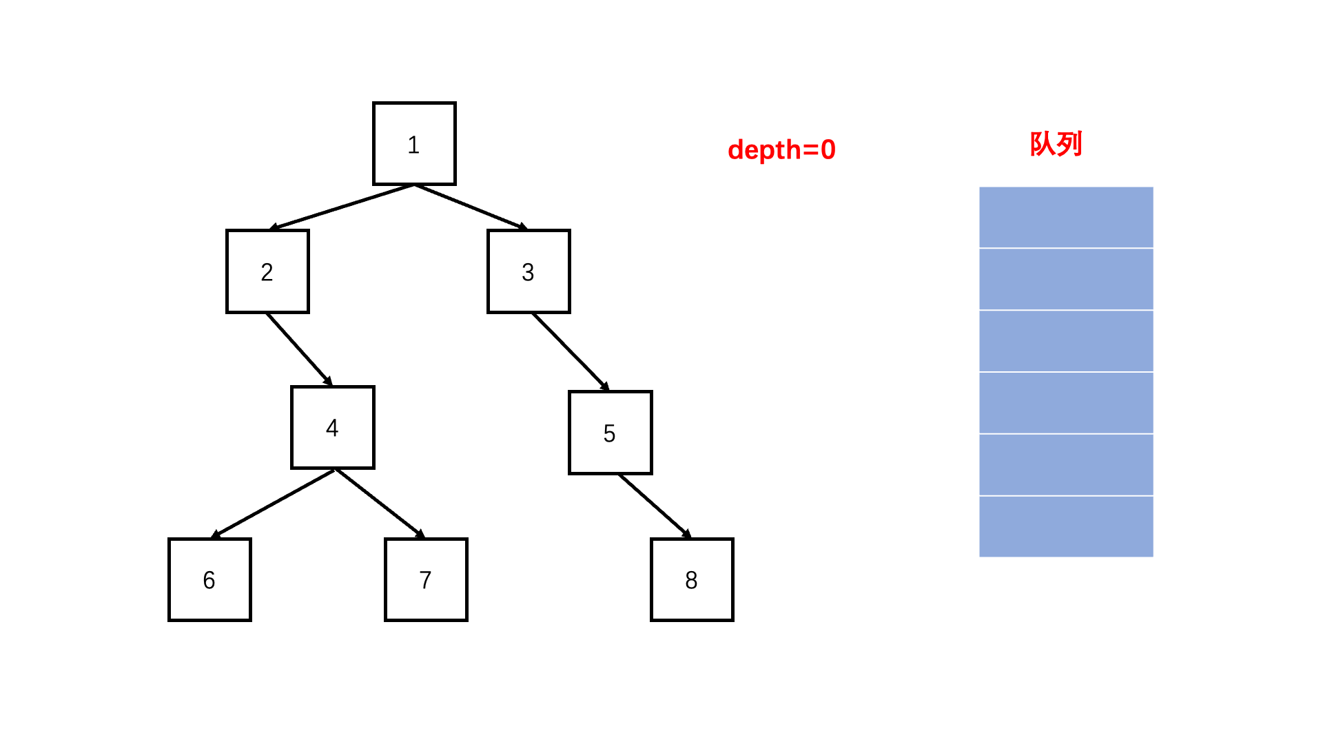 - step 2:在刚刚进入某一层的时候,队列中的元素个数就是当前层的节点数。比如第一层,根节点先入队,队列中只有一个节点,对应第一层只有一个节点,第一层访问结束后,它的子节点刚好都加入了队列,此时队列中的元素个数就是下一层的节点数。因此遍历的时候,每层开始统计该层个数,然后遍历相应节点数,精准进入下一层。
