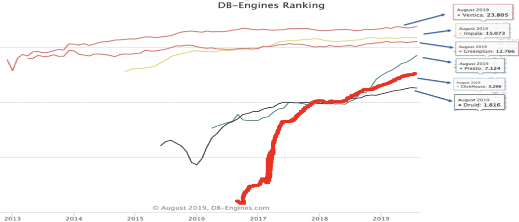 在DB-engines排名上,如下图中红色曲线所示。ClickHouse开源时间虽短,但是增势迅猛。