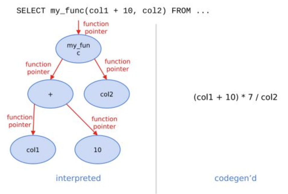 ClickHouse实现了Expression级别的runtime codegen,动态地根据当前SQL直接生成代码,然后编译执行。如下图例子所示,对于Expression直接生成代码,不仅消除了大量的虚函数调用(即图中多个function pointer的调用),而且由于在运行时表达式的参数类型、个数等都是已知的,也消除了不必要的if-else分支判断。